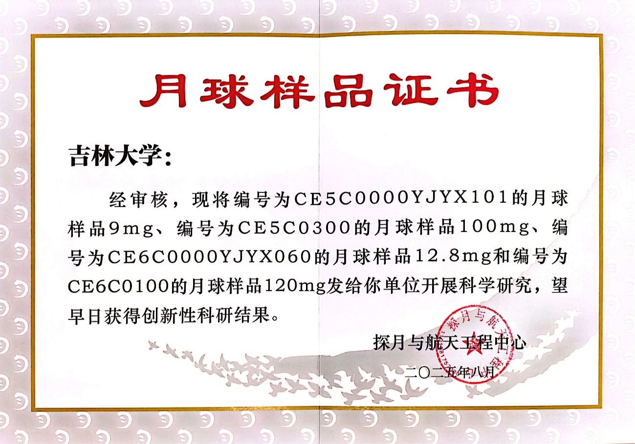 2025年9月1日,公司党委书记杨民,地面力学及仿生行走团队邹猛教授、李秀娟研究员、于庆宇副教授,代表公司赴探月与航天工程中心和国家天文台领取了样品证书和宝贵的月球样品。这是嫦娥六号样品的第二次发放,也是永利yl23411及东三省科研单位获得的第一批月背月壤样品。