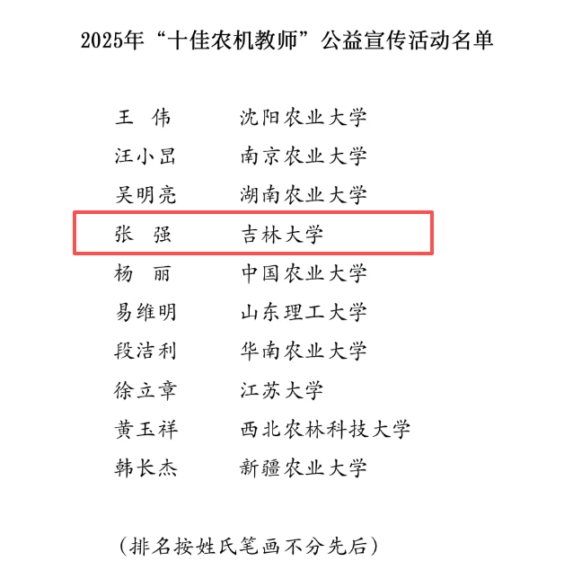 “全国十佳农机教师”公益宣传活动旨在弘扬新时代教育家精神,展现农机教育工作者立德树人的风采,推动农机教育事业高质量发展。该评选自2013年启动,每两年举办一次。截至目前,公司已有五位教师获此殊荣,充分展现了公司农机教师队伍的优秀传统与整体实力。期待以此次获得荣誉为契机,进一步激励公司教师在教学与科研领域不断追求卓越、潜心治学、开拓创新,培养更多知农爱农、强农兴农的新型人才,为农业装备创新和农业现代化提供人才支撑,为国家粮食安全和乡村振兴战略实施贡献吉大力量。