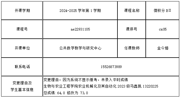 关于公司2023级马鑫凯同学微积分BⅡ课程成绩更正的公示