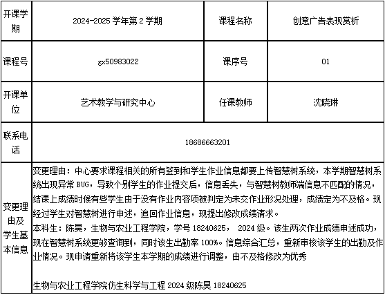 关于永利yl234112024级陈昊同学创意广告表现赏析课程成绩更正的公示