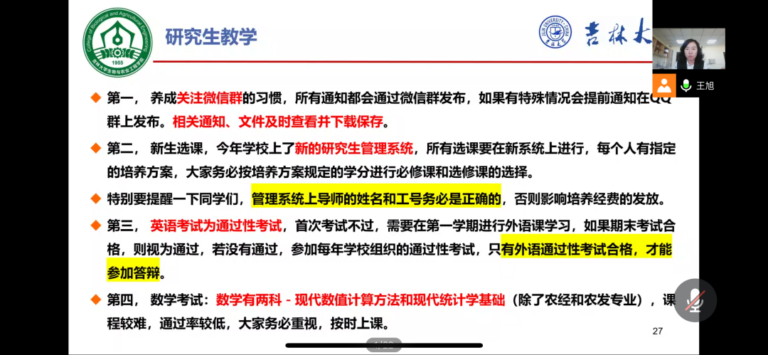 随后,王旭老师介绍了研究生思政方面的入学教育。主要包括常用信息(办公地点、联系方式及常用网址)、研究生日常管理(办理请假、离校返校请假说明、住宿变更、研究生医疗保险、其他事务办理)、研究生奖、助、贷、补(荣誉称号、纪律处分、奖学金评优、助学贷款、经济关注对象、困难补助)、研究生党员发展、重要提示、近期工作以及主要员工工作七个方面,内容详尽。
