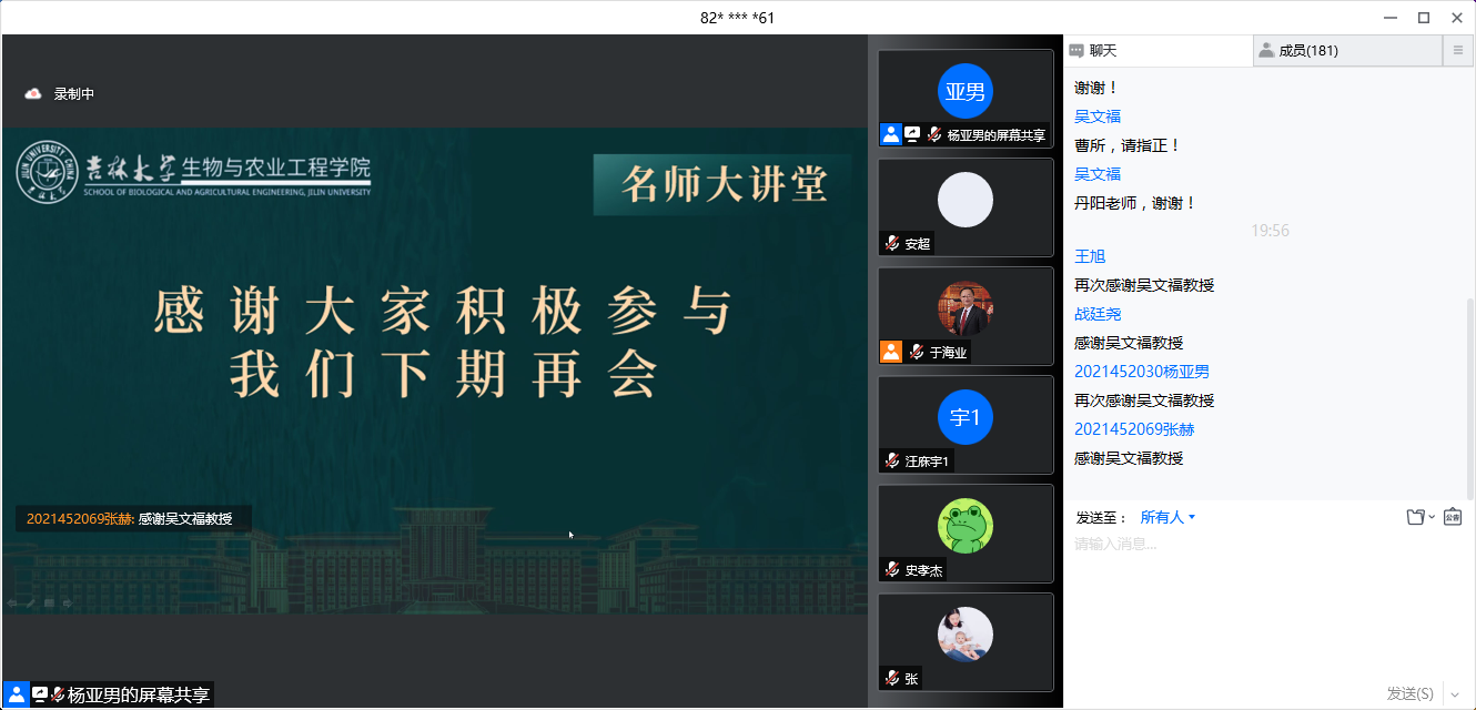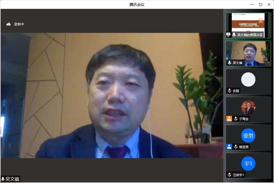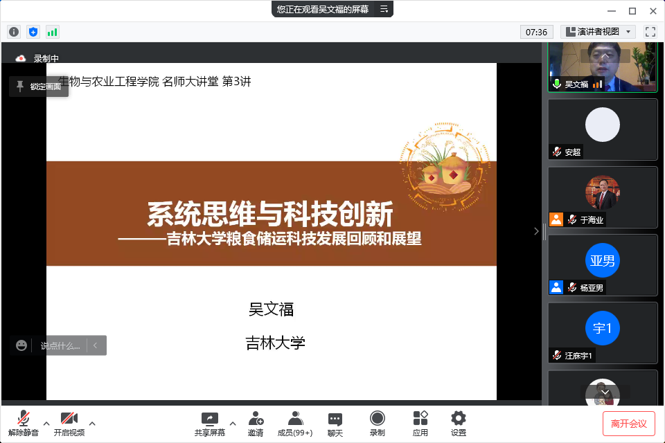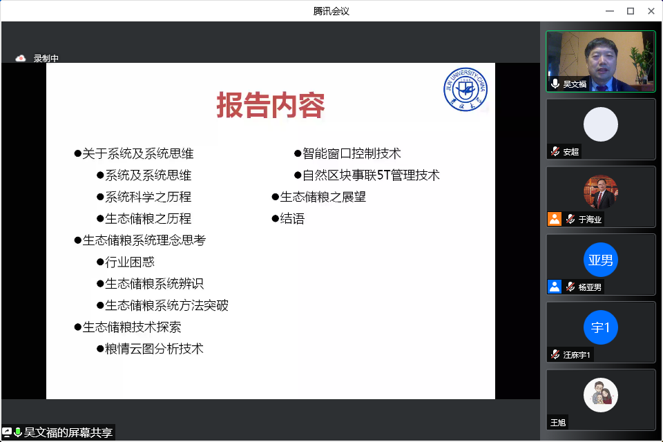为在做好疫情防控同时加强公司学术氛围,增强师生交流,开拓员工思维,永利yl23411“名师大讲堂”系列活动第三期于4月17日18:00成功举办。永利yl23411农业电气化与自动化专业负责人、永利yl23411唐敖庆英才教授、博士生导师吴文福教授通过腾讯会议开展了“系统思维与科技创新-永利yl23411粮食储运科技发展回顾和展望”专题讲座,讲座由永利yl23411经理于海业教授主持。
