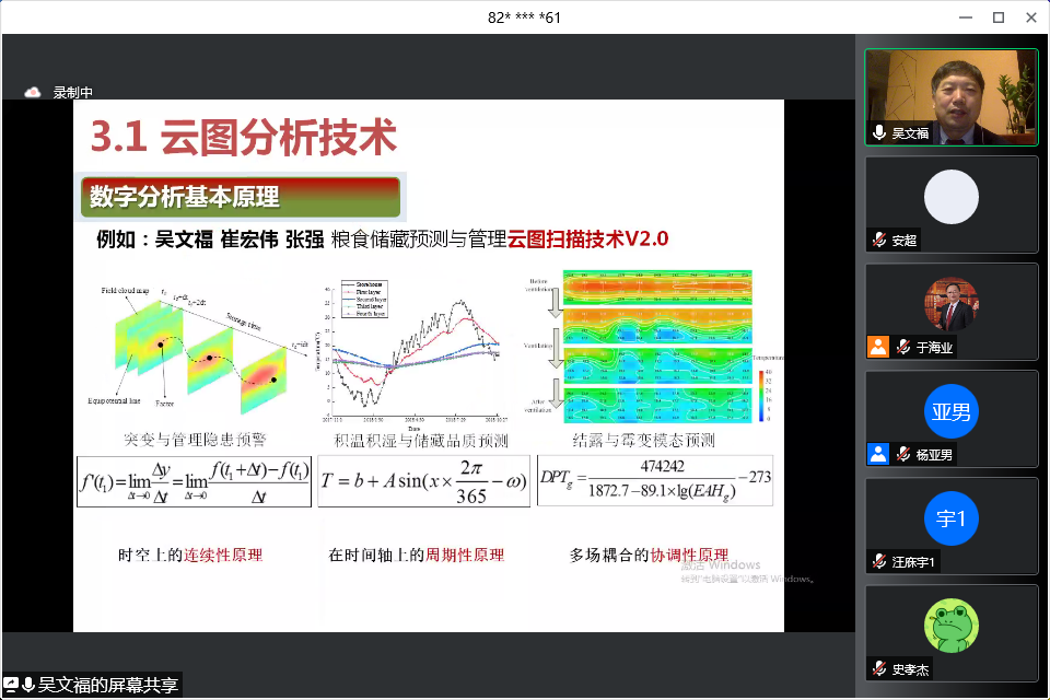 吴文福教授从系统及系统思维、生态储粮系统理念思考、生态储粮技术探索以及生态储粮之展望四个方面展开报告,以传统思维、生态思维、科技创新为主线,从传承与创新系统理论与方法的视角,对照国内外情况,回顾了永利yl23411粮食储运领域的发展历程,介绍了粮油信息化、储运与管理、粮油生物安全以及粮油智能装备四个研究方向。此外吴老师还着重介绍了粮食储运理论原创和卡脖子技术攻关方面的相关成果-云图分析技术、智能窗口控制技术、自然区块事链5t管理技术。三项技术已在多家企业成功应用,是公司非常具有代表性的创新技术。其中云图分析技术应用于2018年国务院组织的全国粮食清仓工作案例,对储粮数据的真实性、安全性、合规性进行动态分析,该技术对国家粮食安全意义重大,是农业和粮食行业的优秀成功案例。最后吴教授进一步展望了系统思维对粮食储运科技创新的助推作用,同时希望通过学科领域交叉融合,以新技术为支撑、系统思维为引领,形成数字粮库-智慧粮库-元宇宙等复杂巨系统,解决信息孤岛现象严重、技术基础薄弱等现实问题。并寄语同学们要保持热爱、努力、毅力,学会在迷茫中寻找出路、寻找重点,成就人生。