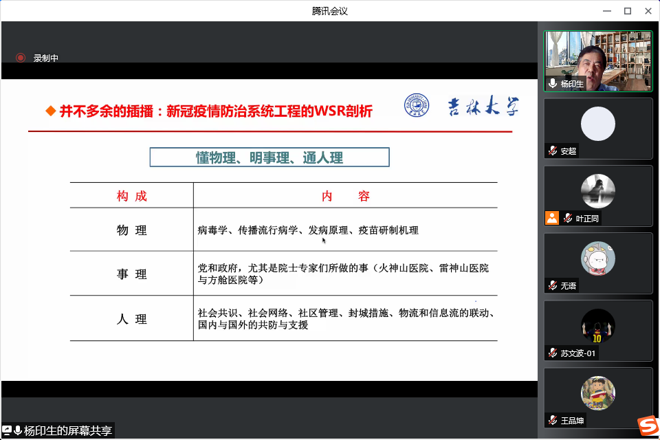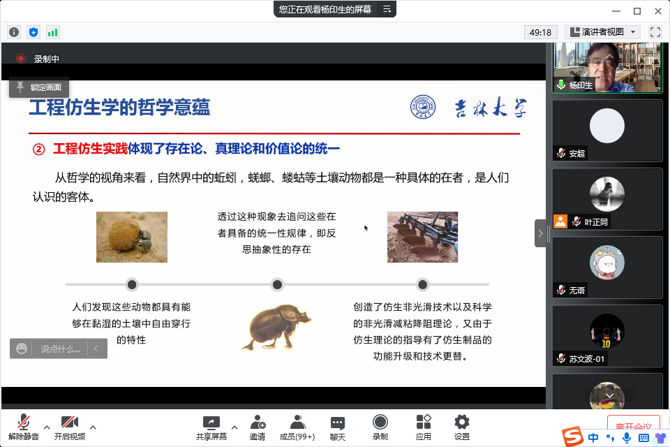 杨印生教授从工程仿生学的朴素思想形成、现代科学知识体系逻辑的建立、工程仿生学蕴含的哲学思想等内容逐一展开,指出工程仿生学从其朴素思想的出现到现代知识逻辑体系的形成从来都没有离开过哲学思想的启迪,工程仿生学具有创新的哲学基础和哲学意蕴。随后杨老师从工程仿生思维、工程仿生实践、工程仿生行为、工程仿生过程和工程仿生目标等五个方面剖析了工程仿生学的哲学意蕴,并基于霍尔三维结构和WSR原理阐释了工程仿生学的系统思想体系构成,分析了工程仿生系统工程的特点和工程仿生系统设计与实践的过程中存在的五个问题。提出工程仿生学体现了哲学上思维和存在的关系问题并通过哲学上的思维思辨逐步构建了较为完善的逻辑和技术体系,工程仿生学的发展离不开哲学的指导,其涉及的问题也为当代哲学的前沿研究提供了丰富的理论空间。在防控疫情的特殊时期,杨印生老师还分享了WSR原理鼻祖顾基发先生基于WSR原理对新冠疫情防治系统工程的分析,表明吉林省疫情防控工作正是做到了WSR原理中的懂物理、明事理、通人理,一定会取得抗击疫情最后的胜利。