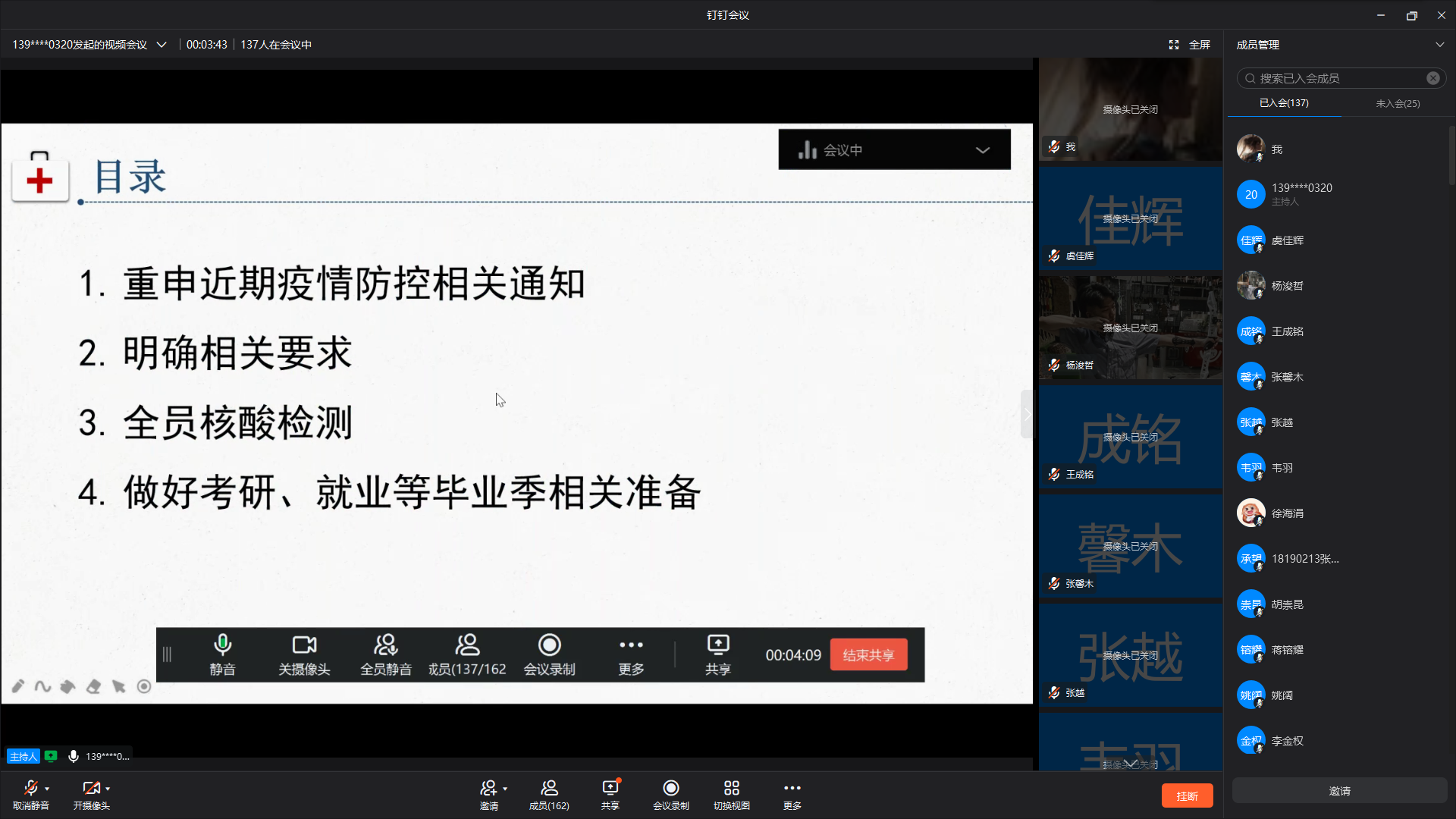 本次会议中辅导员着重强调了本次疫情防控的紧急性和迫切性。毕老师针对下一步疫情防控相关工作做出如下通知和要求:一、公司高度重视本次防控,将持续认真开展排查工作。二、即日起,同学们出入公寓、食堂、图书馆、教室等公共场所或人流密集的室外场所,必须佩戴口罩,不佩戴口罩的,不得进入相关区域。三、同学们要做好每日健康监测及打卡工作,确保打卡率,未打卡员工说明原因。四、如员工出现发热情况,要立即上报导员,按有关流程处理。确保返校员工完成返校后核酸检测,逐一核验结果并确认,"不漏1人"。五、同学们不要在网络发布不真实言论,不传谣,不信谣。六、同学们要做到非必要不离校,非必要不离长。此后,辅导员对同学们的新学期学习生活做出了关照,要求同学们在做好疫情防控的同时尽快适应新学期新生活,做到认真、专注、目标明确。