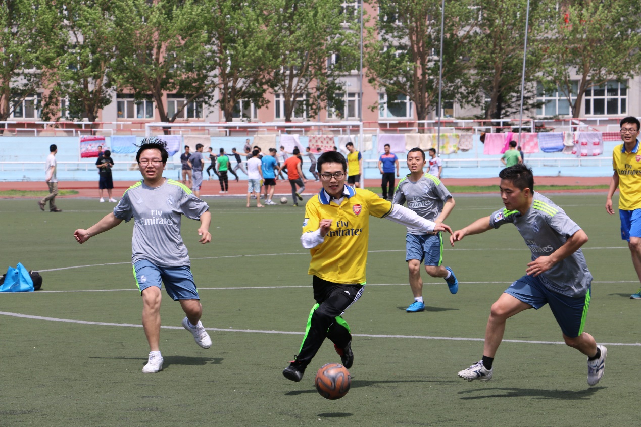5月18日的比赛,分别是研一队对阵研三队,研二队对阵博士教职工队。一声哨鸣,一脚开球,赛场上两场角逐同时展开,场上的队员们密切协作、相互配合,奋力争夺每一球;场下的观众们则鼓掌喝彩、呐喊欢呼,为队员们加油鼓劲。