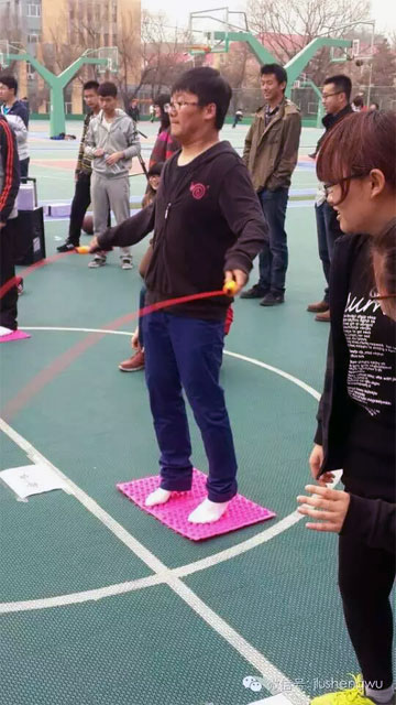 在篮球场的游戏中,狂吃接力马上让同学进入比赛状态,十分精彩,观众都开怀大笑:气球上切豆腐实在是考验了耐心和稳劲:速度与智力碰撞的问答比赛以及最精彩的趾压板让同学活动开筋骨,开始了校园内的奔跑之程。