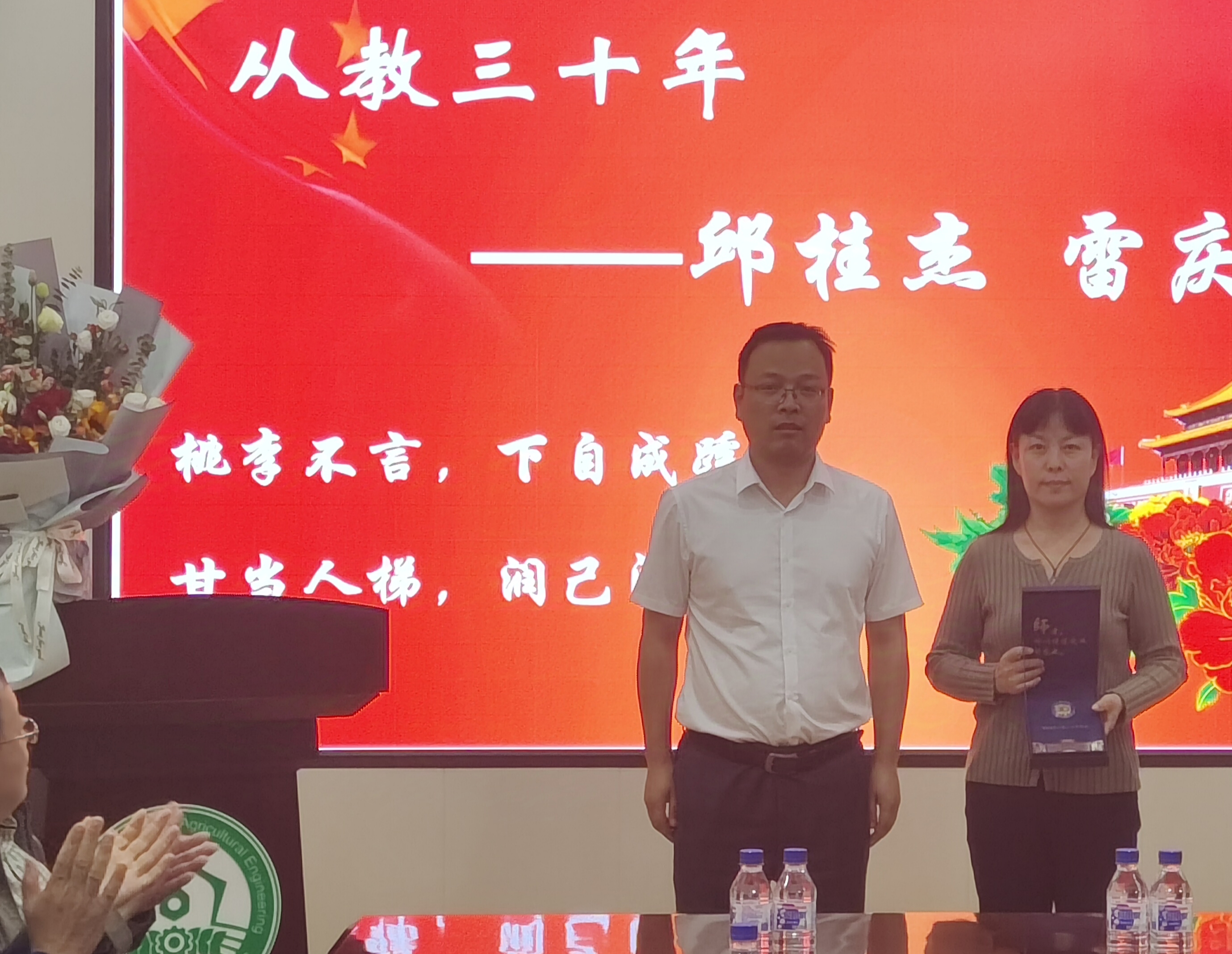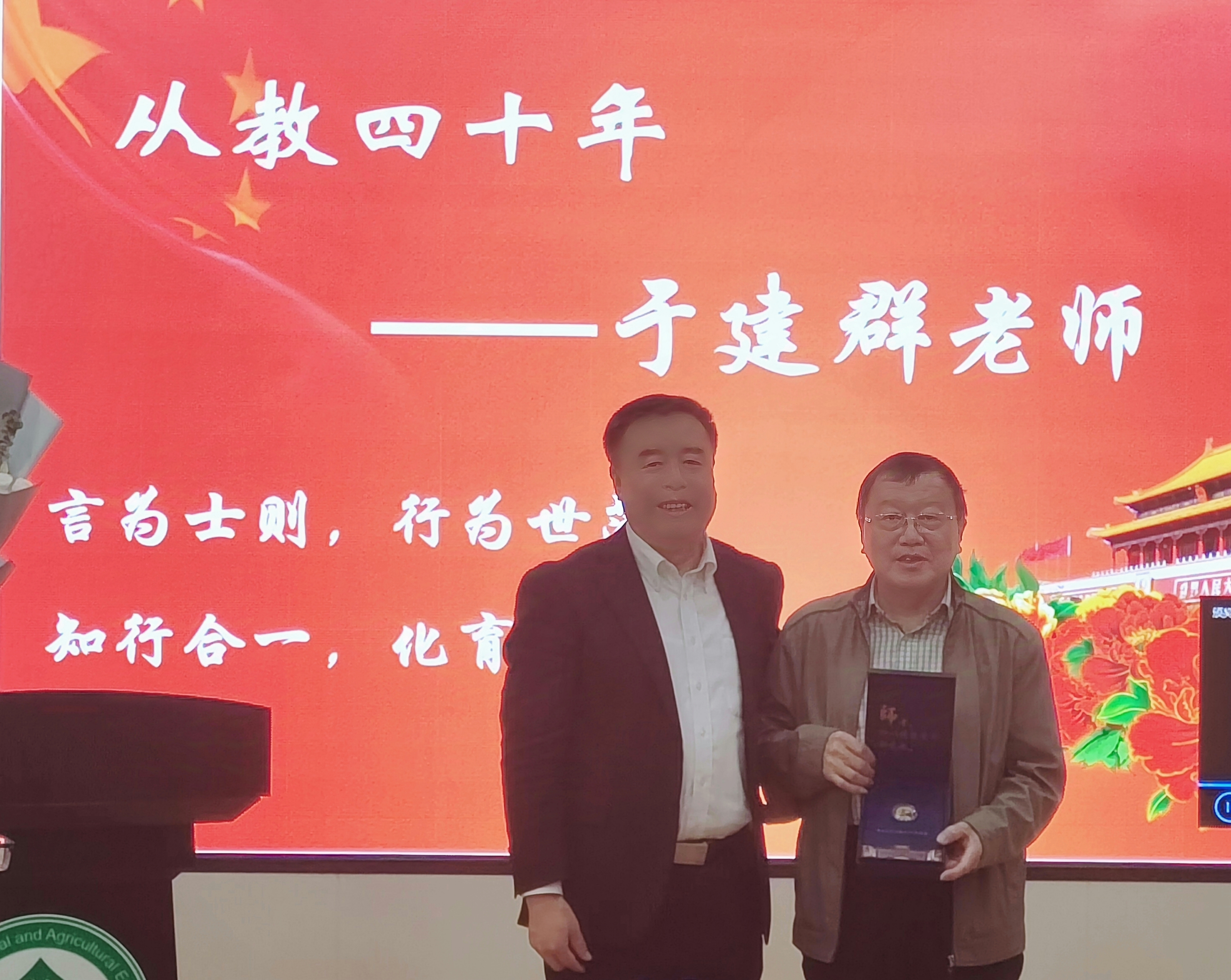 杨宝泉书记为与会教师代表解读公司从教荣誉勋章的深刻寓意,宣读获得公司从教荣誉勋章获得者名单,钱锋副经理、郭鸿鹏副经理分别为获得从教10年及20年的教师颁奖,付君经理、杨宝泉书记分别为从教30年及40年的教师颁奖。付君经理为新入职的四名教师颁授新入职荣誉勋章。