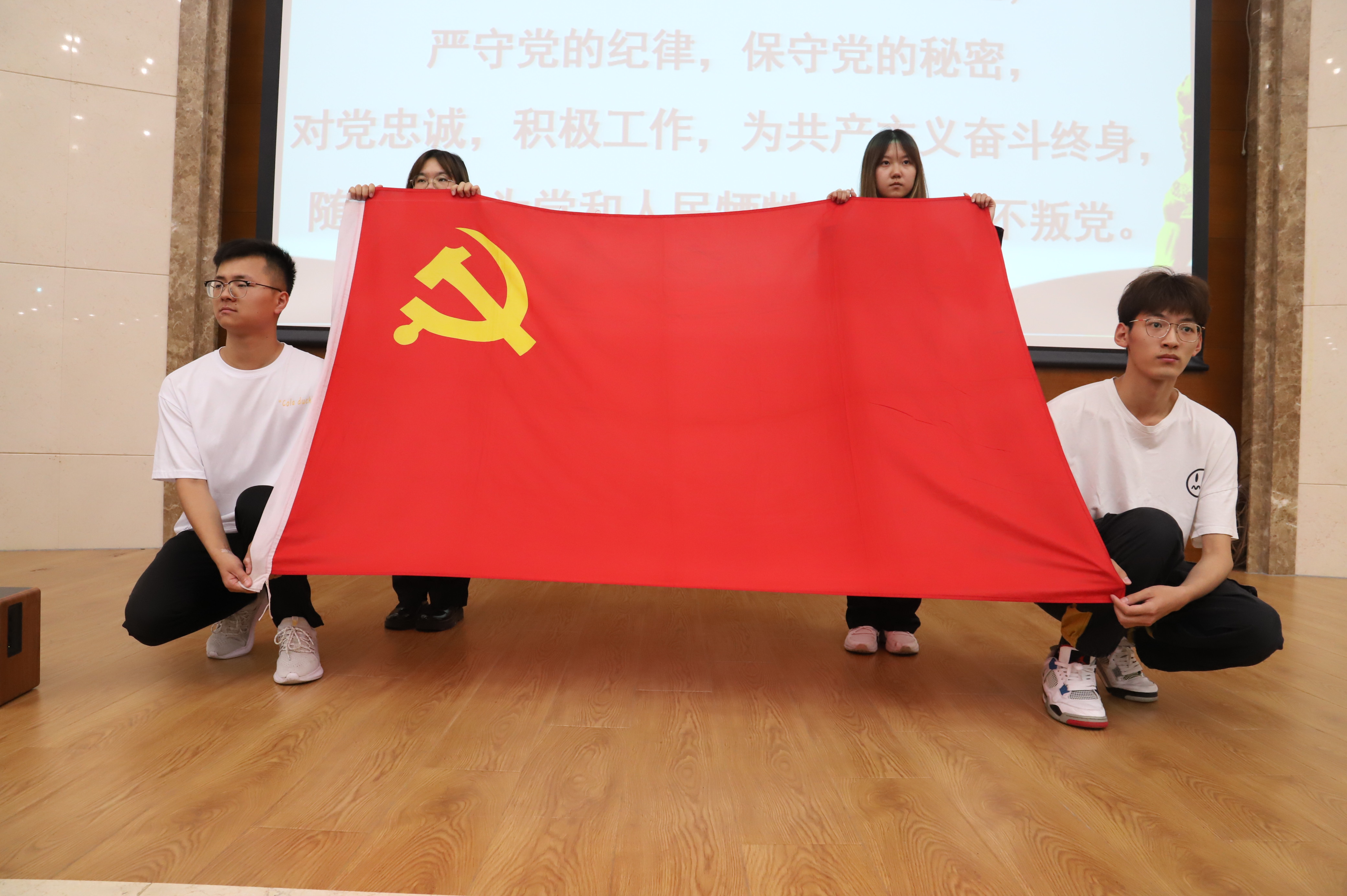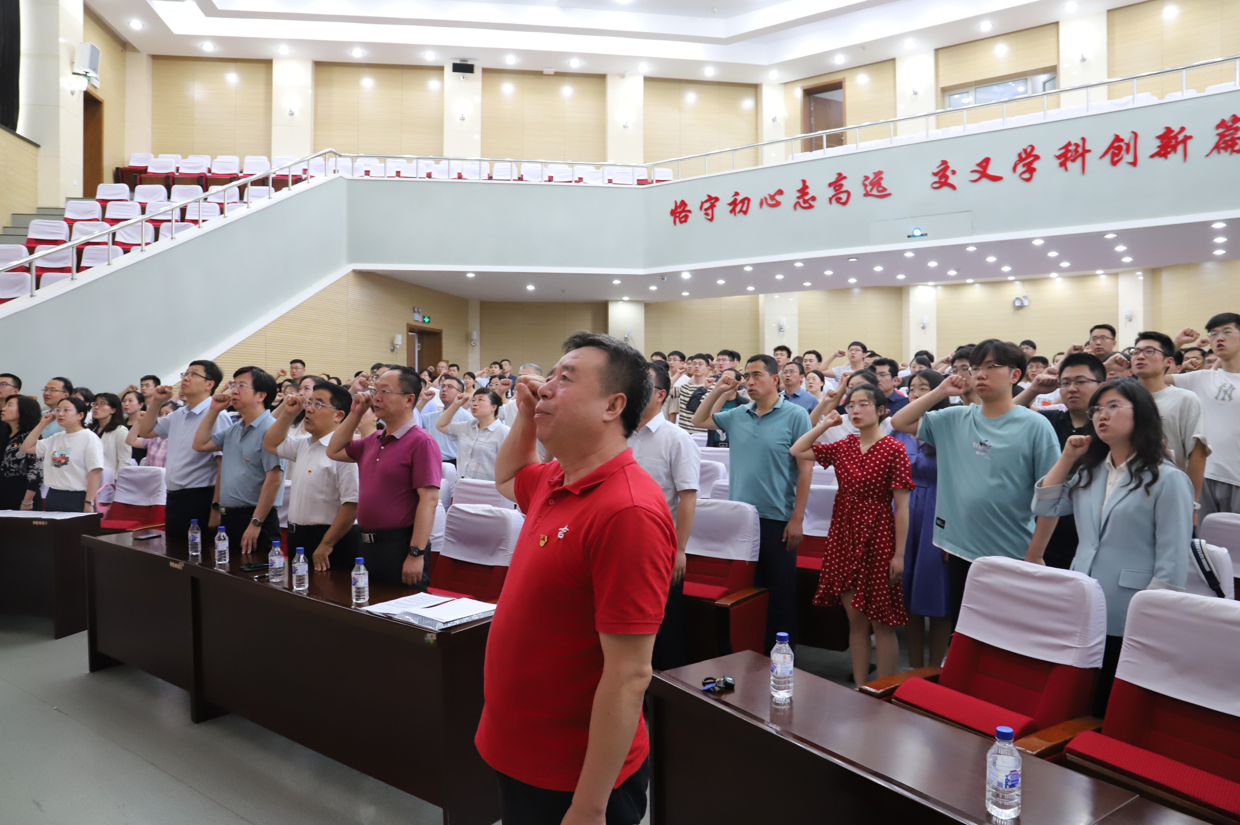 最后,由杨宝泉领誓,新党员进行入党宣誓。面向鲜红的党旗,全体新党员举起右拳,庄严宣誓。在座的共产党员也重温了入党誓词,受到了教育。