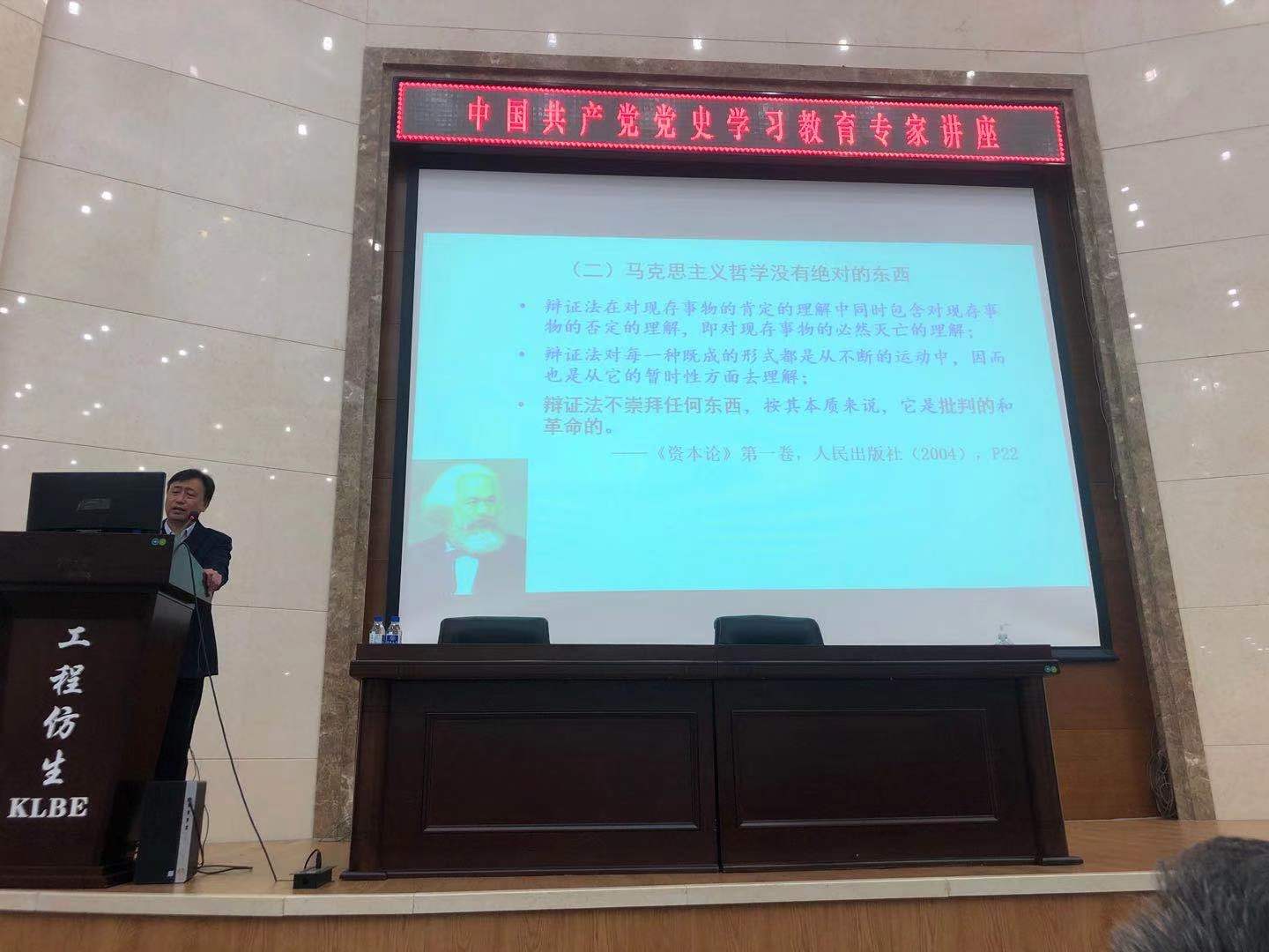 4月23日,永利yl23411在仿生楼一楼报告厅举办了党史学习教育专题辅导讲座。机械与航空航天工程公司、汽车工程公司、材料科学与工程公司、交通公司、食品科学与工程公司的处级领导干部、师生党员代表以及东区事务办公室的领导和党员同志参加专题辅导讲座。讲座由公司党委书记杨宝泉主持。