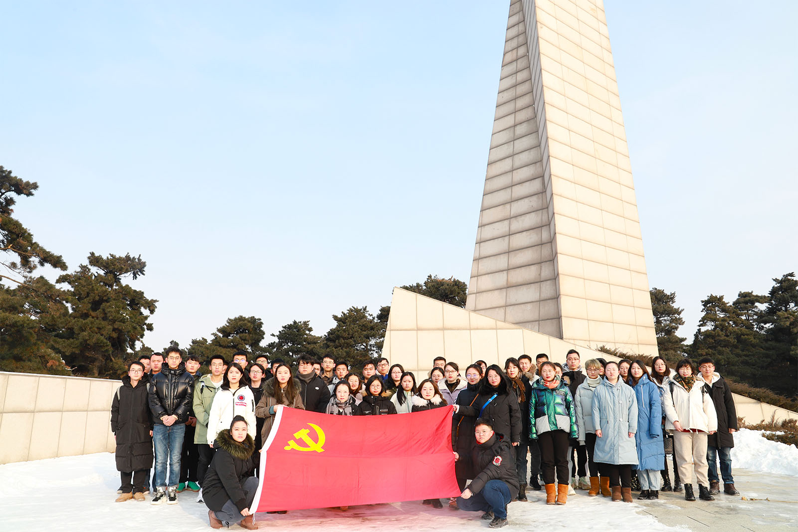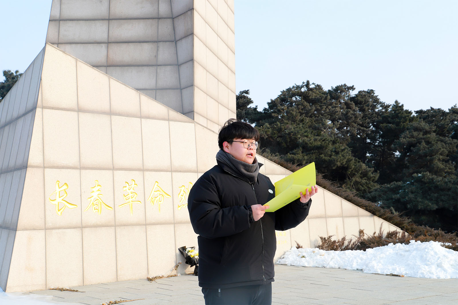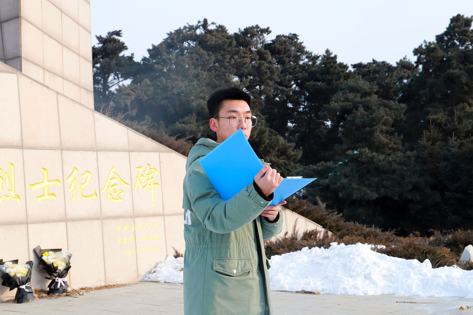 抵达目的地后,由本科生第二党支部组宣委员杨宇宁主持,师生向革命烈士纪念碑敬献了花篮,研究生第二党支部书记宋文达代表员工党员作了发言。