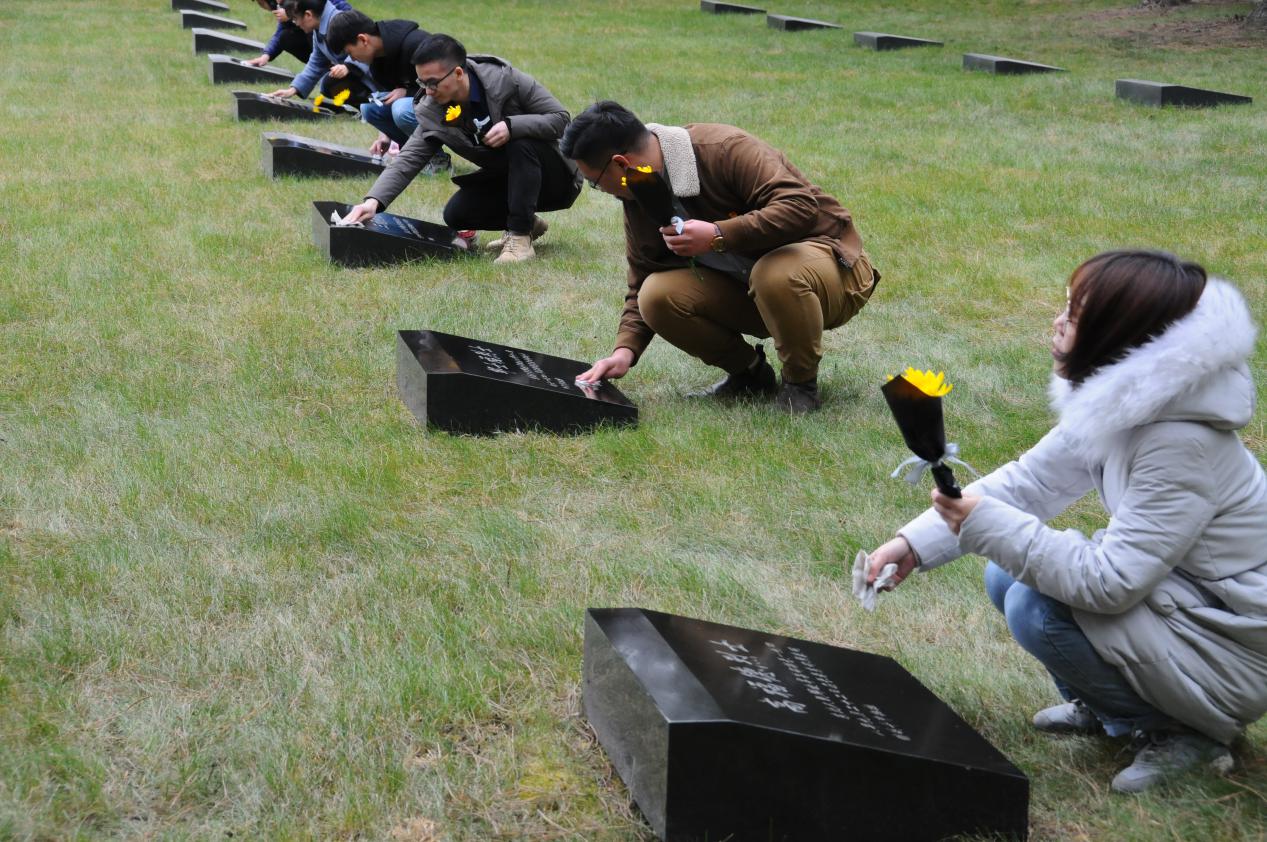 上午11时,全体党员怀着沉重的心情向革命先烈敬献鲜花,并小心擦拭墓碑,缅怀长眠于此的革命先烈。