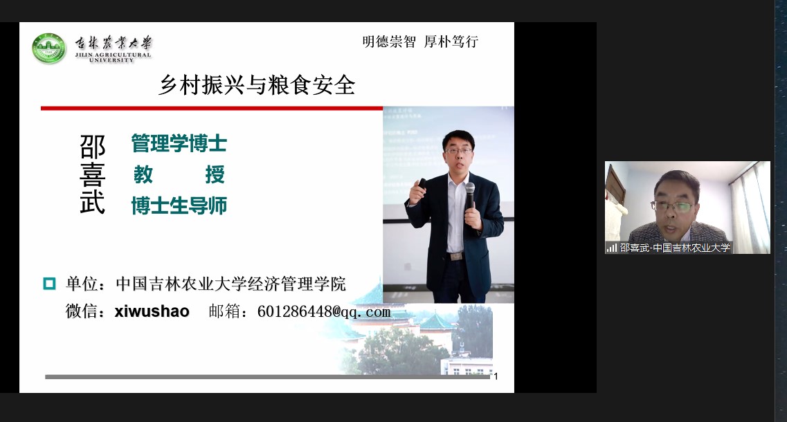 上午的分会场由郭鸿鹏教授主持,田村善弘教授和邵喜武教授分别做了题为“日本可持续的食品消费和消费政策”和“乡村振兴与粮食安全”的报告。田村善弘教授详细介绍了日本食品流通系统特点、发展现状,用大量数据说明了日本食品零售业变化与消费者食品支出变化等。邵喜武教授立足阐释乡村振兴与粮食安全关系,重点介绍了我国和吉林省粮食产量与粮食安全,提出牢牢守好“谷物基本自给、口粮绝对安全”的底线目标。下午的分会场由杨印生教授主持,李钟寅教授和郭鸿鹏教授分别做了题为“韩国农业现实与农村融合产业”和“中国的农业绿色发展:从国家战略到行动落实”的报告。李钟寅教授针对韩国的经济变化、农户状况、农业六次产业化等内容进行了交流。郭鸿鹏教授针对中国农业发展面临的挑战、农业绿色发展理论与中国现状、农业绿色发展行动落实与展望等内容进行了大会交流。