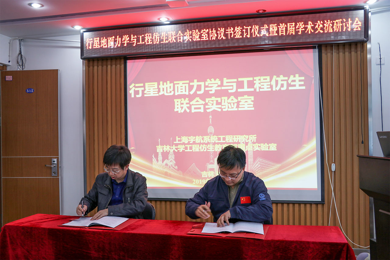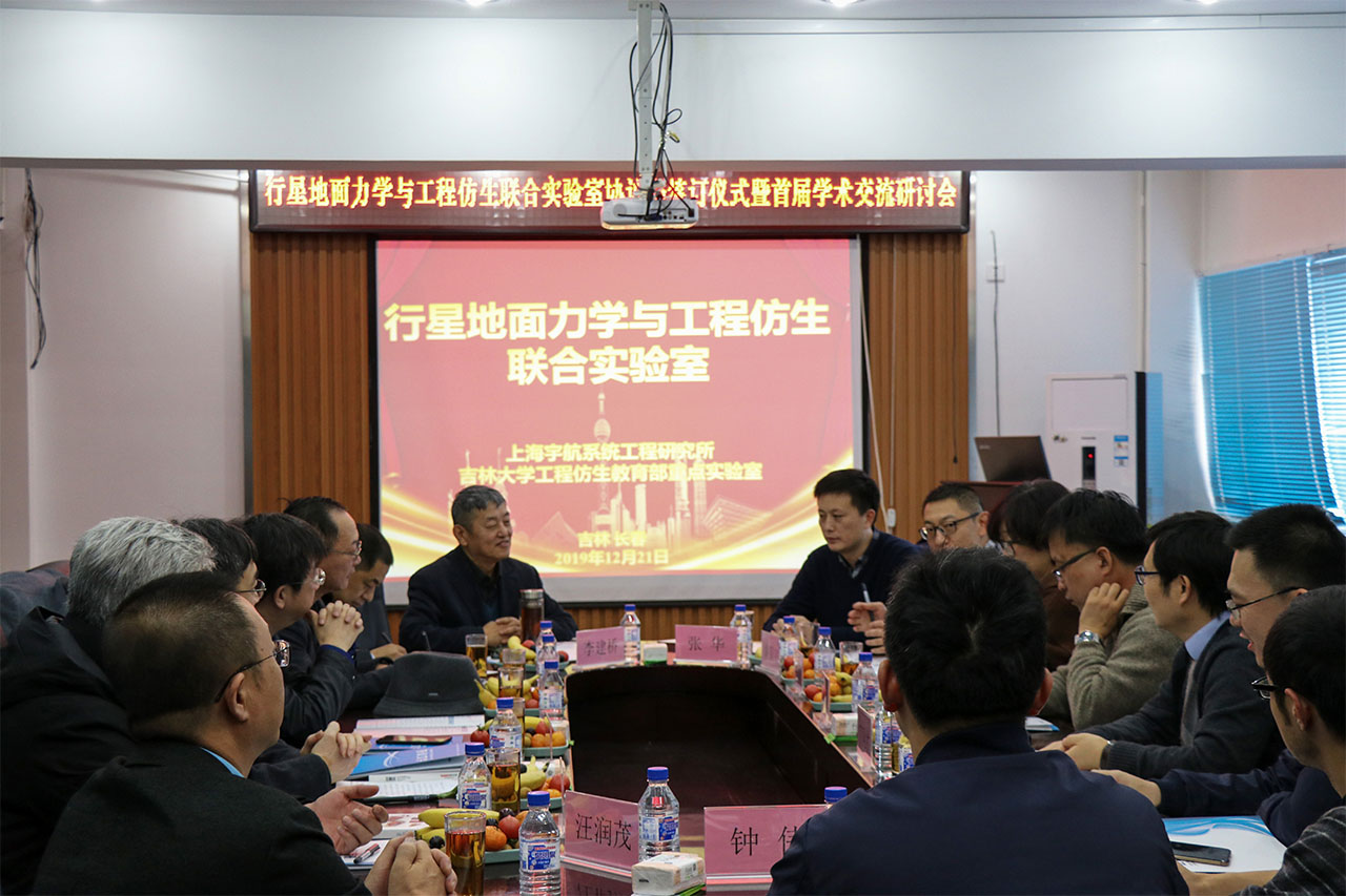 2019年12月21日,永利yl23411工程仿生教育部重点实验室和上海宇航系统工程研究所,在永利yl23411南岭校区仿生楼512会议室签署了行星地面力学与工程仿生联合实验室合作协议,并召开了首届学术交流研讨会。上海宇航系统工程研究所副所长刘鲁江、探月项目办主任丁同才、研究发展处处长余兵、副总师胡震宇、张华研究员、研究室主任王卫军、联合实验室申报工作主管徐焘、探月项目办项目主管钟伟,永利yl23411科学技术处副处长陈玉江、先进技术研究院副经理于雪峰、永利yl23411经理于海业、机械与航空航天公司副经理王继新、工程仿生教育部重点实验室主任韩志武、国际仿生工程学会秘书长李建桥、国际工程仿生学会秘书处办公室主任汪润茂等出席了会议。此外,来自永利yl23411地球探测科学与技术公司、机械与航空航天公司、永利yl23411、工程仿生教育部重点实验室的师生代表参加了会议。会议由国际仿生工程学会秘书长、工程仿生教育部重点实验室李建桥教授主持。