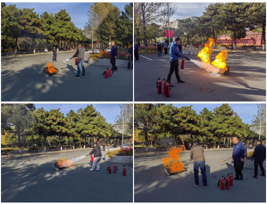 东区保卫办公室消防科王中刚老师讲授了校园消防知识并强调了出现火情的注意事项,介绍了不同火种的扑灭方式以及不同消防器材的使用场景,并演示了灭火器的使用方法。现场师生踊跃参与,在保卫办的指导下熟悉灭火器的使用,进行实地灭火演练。