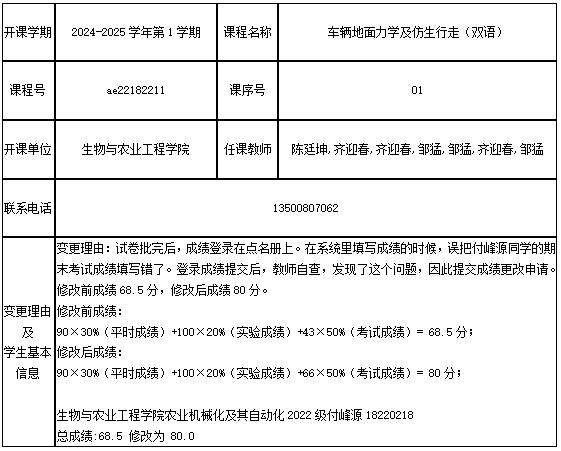 关于公司2022级付峰源同学车辆地面力学及仿生行走(双语)课程成绩更正的公示