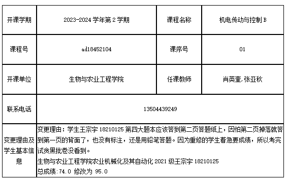 关于公司2021级王宗宇同学机电传动与控制B课程成绩更正的公示