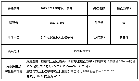 关于永利yl234112020级王添一同学理论力学A课程成绩更正的公示